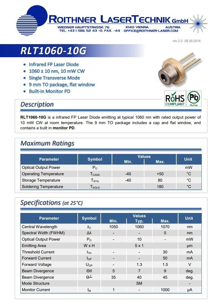 [2 Pcs] Roithner LaserTechnik RLT1060-10MG, 1060 nm, 10 mW, sm, 9 mm Laser Diode[2 Pcs] Roithner LaserTechnik RLT1060-10MG, 1060 nm, 10 mW, sm, 9 mm Laser Diode