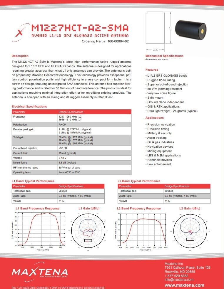 / Maxtena M1227HCT M1227HCT -A2-SMA Active Antenna Rugged L1/L2 GPS GLONASS
